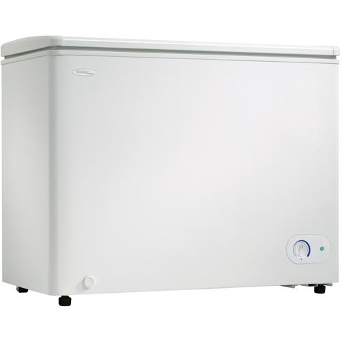 Danby offers traditional style chest freezers to provide the ability to store large items or stack smaller items. The Danby DCFM246WDD Energy Star compliant chest freezer features 8. 7 cubic feet of space and a vinyl-coated basket to store smaller items. The aluminum interior keeps the cold air inside, is rust resistant and easy to clean. This chest freezer has a defrost drain for easy cleaning and a mechanical thermostat for controlling the temperature. The front has adjustable legs for uneven surfaces and back castors for easily moving the freezer. Read more